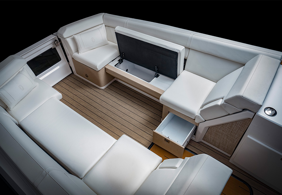 The "L" Layout combines two captain’s chairs and a thoughtfully positioned swing back lounger in the aft section of the vessel. The versatility of the powered backrest allows passengers to sit facing the stern or bow at different angles or lie completely flat while soaking up the sun.