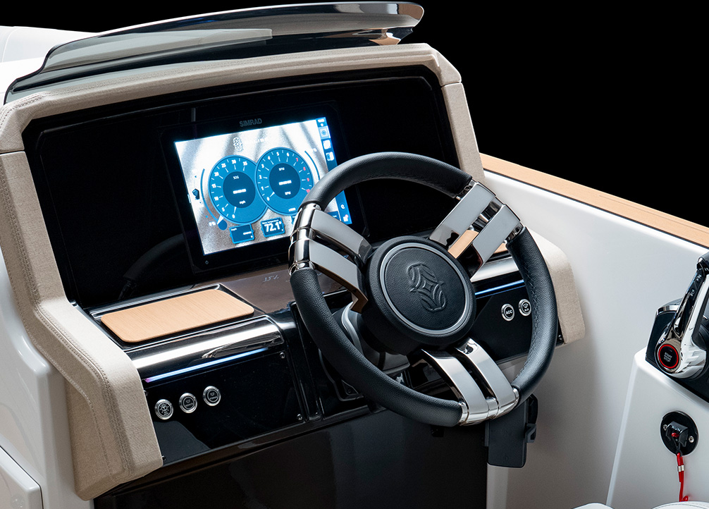The Horizon is available in two configurations: Cruise and Lounge. The Cruise layout features dual-facing bench seats at the aft, enclosed by a custom stainless-steel safety gate for added security. The Lounge layout offers a swing-back lounger in the aft section, allowing passengers to adjust their seating to face either the bow or stern at the push of a button, and also features a custom stainless-steel gate for added safety.